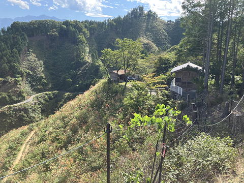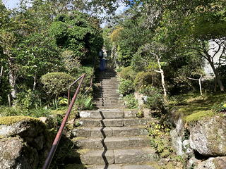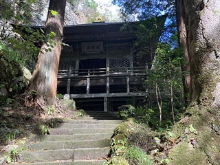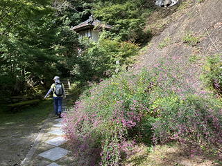 しっとりした苔とピンクの萩の花の間を抜けて境内を奥に進むと、一段高いところに清水寺の舞台のような懸造りの観音堂が現れました。これまた立派な……と驚きながらその足元までは近寄りましたが、何せ帰りのバスのこともあるのでここで時間を使うわけにもいきません。今回はあくまで登山が目的、お寺を隅々まで拝見するのは将来の札所巡りの機会にとっておくことにしようと割り切って先に進みました。