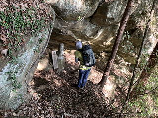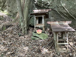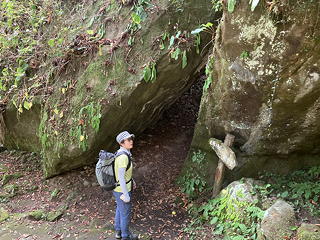 亀ヶ岳展望台から下る途中には雨乞岩と名付けられた大きな岩があり、その足元には由緒不明ながら小さな祠と天井が低く狭い洞窟がありました。このあたりにはこれといったピークがあるわけではないにもかかわらず、随所にこうした信仰スポットが点在しているのがなんとも不思議です。