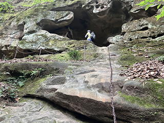 そしてそんな我々らしく、ここで叫べば山彦が返ってきそうだと「ビレイ解除〜!」「登ってくださ〜い!」などと大声でコールしてみたところ、期待以上のクリアさで残響がこだましてきたのには驚きました。気象条件によって効果は違うとは思いますが、ここを通る人にはぜひ山彦が聞こえるかどうか試していただきたいと思います(ふつうに「ヤッホー」でいいです)。