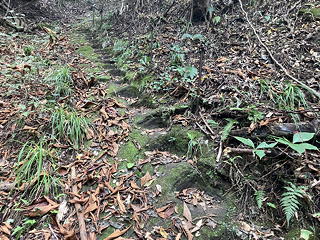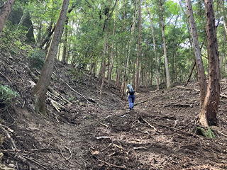 先ほどの標識に書かれていたとおりこの「三ノ峰」の向こう側は緩やかな鎖場になっており、これを下りきったところで考えてみたのですが、二ノ峰を通過してしまっているのだとしたらどうにも気持ちが悪い(私が使っていた地形図には五峰それぞれの位置が示されていません)ので、アユミさんにはそこで待っていてもらって私だけ引き返して確認することにしました。どうせ分岐のところに通じる巻道を使えばすぐだろうという見通しがその前提にあったのですが、いざ鎖場の左手の斜面に踏み込んでみると意外に悪く、途中からはっきりと道を外していることがわかりました。これは丹沢のバリエーションコースと大差ない難しさだなと思いながら慎重に危険回避しつつ「三ノ峰」と一ノ峰の間(巻道分岐点より一ノ峰寄り)に戻り着き、そのまま一ノ峰まで下ってから引き返したのですが、やはり二ノ峰らしきものは現れないままにピーク手前の分岐に達してしまいました。これはいかなこと……と思いつつ今度こそ正しい巻道に入ってみたところ、これまた一般登山道とは言い難い危なっかしいトラバースルートで、先ほどの道迷いも無理がないと思えるほどのワイルドさ。それでもどうにかアユミさんのところに帰り着いたとき、私が悪戦苦闘している間に地図とGPSを付き合わせていたアユミさんから聞かされたのは、この「三ノ峰」は実は二ノ峰であったという御託宣でした。
