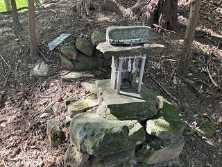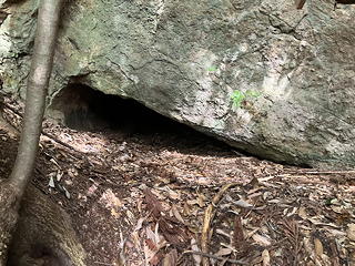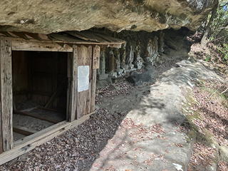 尾根上の岩の露頭を右に回り込むと、そこには「賽の洞窟」と名付けられた岩穴がありました。現在の法性寺は曹洞宗(禅宗の一)ですが、大日如来を祀っているようにかつては密教との関わりがあったようですし、これだけ山中のあちこちにそれらしいポイントがあるところを見ると、このあたり一帯は修験の行場だったのではないかという気がしてきます。