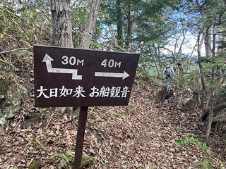 十三仏の先でお船岩が作る尾根に出ることになりますが、まずは分岐を右に進んで岩の舳先にあるお船観音にお参りします。ここは岩の右側に安全な道もあるようですが、我々は当然シューズのフリクションを信じて岩の上をとんとんと歩きました。まことに優美なお姿をした観音様に今日一日の安全を祈願し、岩の舳先から秩父盆地をひとしきり眺めてから、岩の上を戻って今度は大日如来に参詣します。