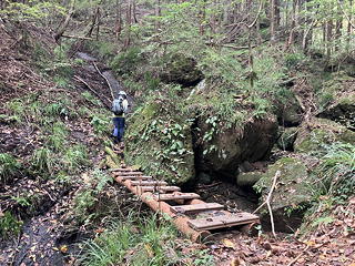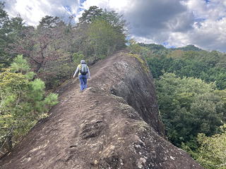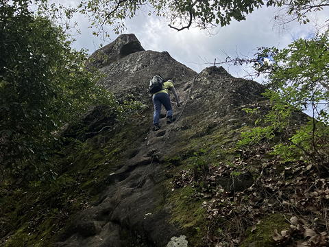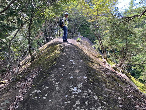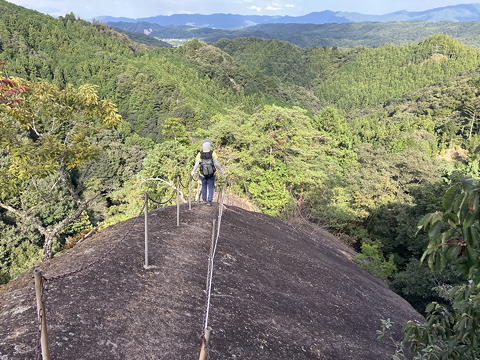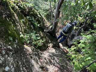 「賽の洞窟」からトラロープ頼みの少々際どいトラバースを行い、ついで目の前に現れる岩場を登ると唐突に開けた場所に出ました。これが兎岩で、2列の鎖の間を安全に下れるようになっていますが、ここも鎖などない昔は修行者にとっての試練の場所であったことでしょう。ところで「兎岩」の名前の由来について、アユミさんは「兎と亀はペア」説を持ち出しましたが、いや、あれは日本の昔話ではなくてイソップ童話なのでは?たぶんそうではなくて、この丸く膨らんだ岩の形が兎の背のように見えることからの命名なのだろうと思いますが、後で我々はすでに二ノ峰や三ノ峰からここを見ていたことに気づきました。これらのピークから進行方向左側の開けた側を見たとき樹林に覆われた隣の尾根の一部に特徴的な岩の露出があって、我々は「あそこに滑り台みたいなスラブがある」などと興味深く語り合ったのですが、「兎の背」のようなメルヘンチックな見方ができなかったのは、きっと二人とも無粋なクライマー感性に毒されてしまっているからに違いありません。