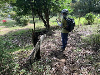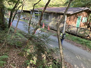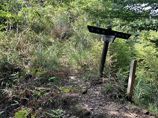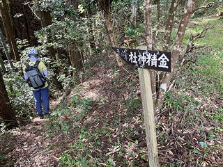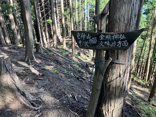 尾根を下りきったところは民宿・長若山荘の裏手で、そこから車道には出ずに「金精神社 五峰」を示す指導標を頼りに沢筋を渡って山道に入りました。植林の中の道は明るく歩きやすいものでしたが、9月も終わろうとしているのにこの日も蒸し暑く、二人とも「暑い!」「風がほしい!」とぼやきが止まりません。