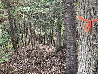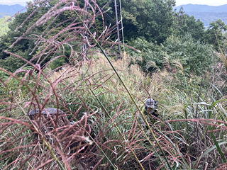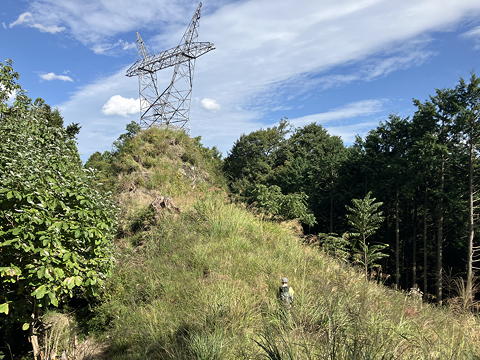すると送電線を通すために尾根上を伐り開いた場所は濃密なススキの薮になっており、棘が痛いイバラらしきものもあって難儀する羽目になりました。どうにかここを通り抜け、さらに林の中のほとんど道なき急坂を登っていくと草の中にひっそりと三角点が隠れている般若山に達しましたが、そこは「山」と言うようなはっきりしたピークにはなっておらず、さらに尾根をしばらく登ったところでようやくテープが目立つジャンクションピークっぽい地形になって、ここから今まで登ってきた尾根を離れてその1本南隣の尾根を下ります。