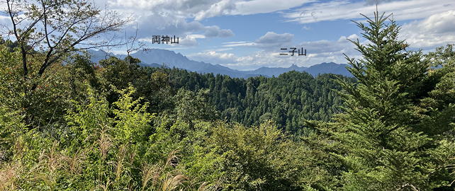五ノ峰からわずかの歩きで達するのは立派な指導標とマンホールのような蓋付き基準点があるP565(釜ノ沢五峰分岐)で、ここは釜ノ沢五峰の尾根と般若山からの尾根が合流する場所です。そしてそこから少し進むと西北西方面の展望が開けて、両神山と二子山がきれいに見えました。特に二子山は西峰と東峰が重なるような角度で見えているため、非常に鋭角的な印象を与える姿をしていました。