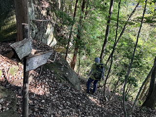 鎖を頼みに岩のステップを慎重に下り、岩尾根の左側に付けられた道をさらに進むと標識が現れて、右は柿ノ久保、左が釜ノ沢だと示していました。地形図で見ると柿ノ久保に下る道はもう少し進んだ先のP478(般若山)で分岐しているはずですが、道が付け替えられているのかな?かたや釜ノ沢へは確かにここから左へ折れる方がショートカットになりますが、どうせ我々は般若山までは登ろうとあらかじめ決めているので、この分岐は無視して先に進むことにしました。