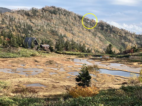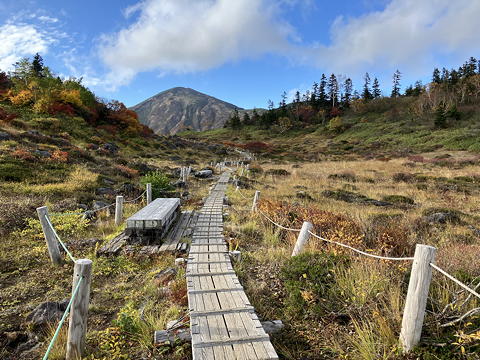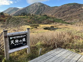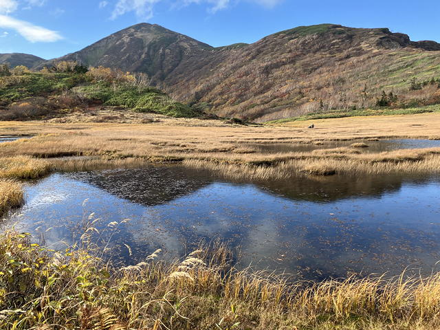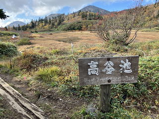 天狗の庭にはいくつもの池が散らばっていますが、正面の大きな池には「逆さ火打」が映っていました。前回ここに来たときにこうした眺めに出会った記憶がないのですが、そのときはまだ10月下旬だったにもかかわらず雪に覆われていたため、今とは景観が異なっていたようです。