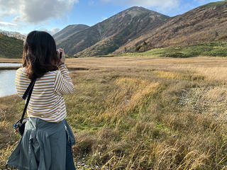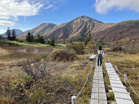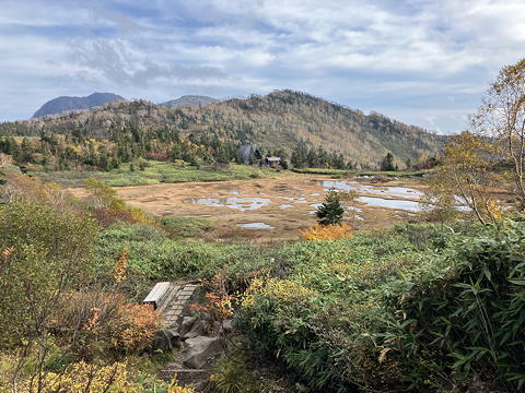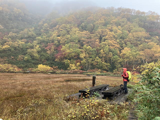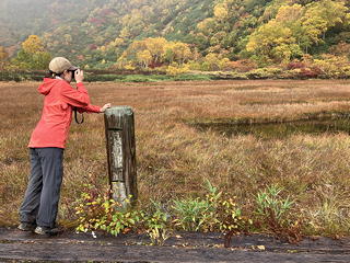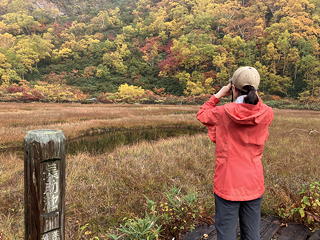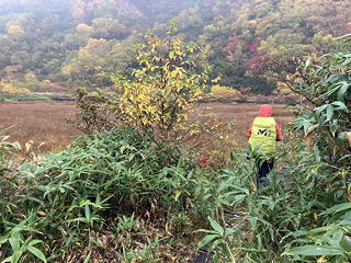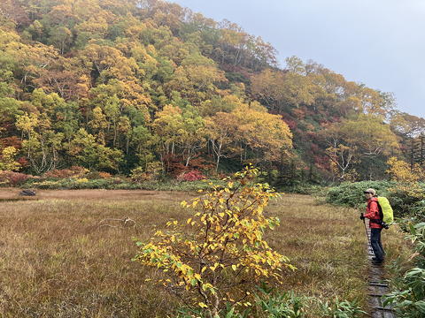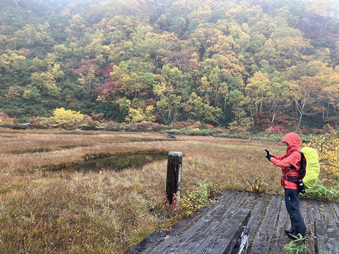 目の前に広がったのは草紅葉の中に池塘を点在させ、周囲を紅黄葉で囲まれた長助池のすてきな眺めでした。これにはトモミさんも私も大喜び。どうやら妙高山のピークハントをやめてこちらに回ったのは良い判断だったようです。