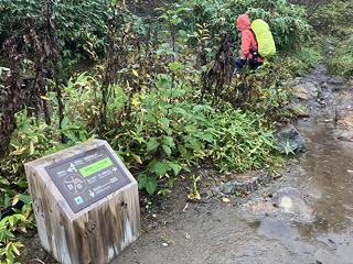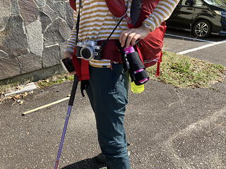 トモミさんの腰にはマイ熊スプレーと共にコンパクトなカメラ。トモミさんとの山行では、写真撮影が大きなウェイトを占めるために標準コースタイムのアバウト1.2倍くらいの時間を見込むことになるのですが、今回は2日目の行程が長いことと天候に不安要素があることから機動性重視のチョイスとなったようです。もっとも前泊やら何やらでリュックサックは若干重め。がんばりましょうと気合いを入れて、ゲートで入域協力金500円を支払ってから出発しました。