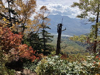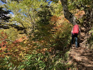 黒沢の橋を渡ったら十二曲りと呼ばれるつづら折れの急坂になり、標高を上げるにつれて紅葉が見られるようになってきました。背後には乙見湖の向こうに高妻山や戸隠山が見通せて気分がいいのですが、十二曲りが終わったら平坦になるかと思いきや、さらに淡々と標高を上げ続けなければならないのがつらいところです。