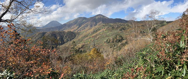 火打山が見えてきました。その向こうには焼山も特徴的なドーム型の姿を見せています。私が火打山と妙高山に登ったのは1989年のことで、そのときは焼山は火山活動のために登山禁止だったと記憶していますが、今は登山届を提出すれば縦走が可能となっています。