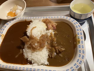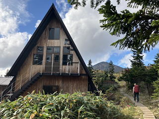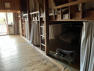 受付をすませて旧館2階の宿泊場所に案内されると、かつてであれば間違いなく2-3人分とされていただろう広いスペースを1人用としてあてがってもらえ、しかもそれぞれがカーテンで仕切られていました。とりあえず荷物を置いて1階のカフェでケーキセットをいただき、カフェの営業終了時刻である15時になったところで天狗の庭へ散歩に行くことにしました。