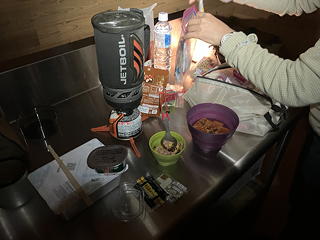 冒頭に記したように、2日目は早出をして火打山をピストンするつもりだったので朝食は自炊としていましたが、昨夜の天気予報ではこの日の朝方は雨模様ということだったので、火打山登山は早々に断念することになりました。そんなわけでゆっくり目の5時に起床し、あらかじめ指定されていた自炊可能場所で自前の朝食をとってから出発の準備に取り掛かりました。