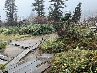 昨日歩いた天狗の庭への道の途中から右へ折れて、結果的に今回の山旅の最高地点となった茶臼山(2171m)を越え、黒沢池ヒュッテへ向かいます。この前後の道は登りも下りも緩やかで、雨の中でも歩きやすいものでした。