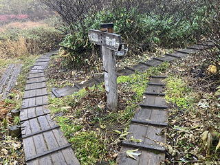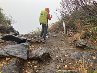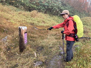 はっきり雨模様の中、黒沢池ヒュッテには立ち寄らずにその前で小休止をとってから、引き続き妙高山方面の道に入ります。このとき黒沢池ヒュッテの宿泊客二人もほぼ同時にここを発ちましたが、彼らはそのまま下山するらしく富士見平方面の道に入っていきました。