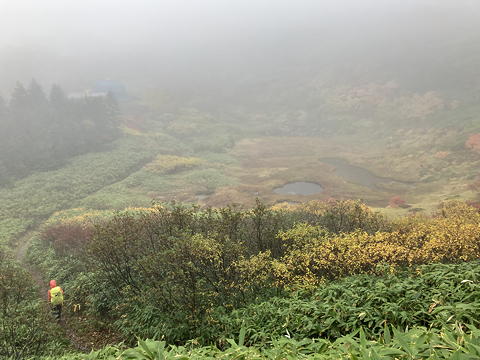 ……とは言うものの、せっかくの眺めがガスに霞んでしまっては意気が上がりません。眼下に黒沢池(のほんの一部)がぼんやりと現れたときは多少モチベーションが上がりましたが、これも本来の姿ではないはずです。