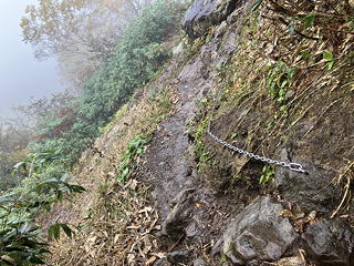 道は妙高山の外輪山の一角にあたる大倉乗越を越えて、外輪山の内壁に沿ってほぼ水平に南に向かいます。そのところどころには鎖もありますが、さして危険があるようにも思えません。これはおそらく、初夏まで残る残雪の横断の際に滑落する事故が多いのでしょう。