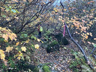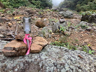 もし増水していたらここは渡ることはできず、そうなったらせっかく下ってきた道を登り返して外輪山に上がることになるところでしたが、昨日・今日の降水量からの読み通り沢の水位は上がっておらず、飛び石をつないで難なくここを渡ることができました。