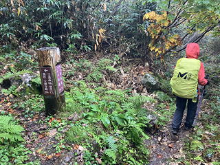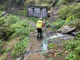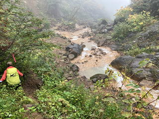 さらに清冽な水を滾々と湧き上がらせる黄金清水を過ぎる頃から、再び雨脚が強くなってきました。この雨の中で急坂を下る道はぬかるみ、スリップに神経を使いながらの歩きになりましたが、トモミさんの歩くスピードは一向に落ちません。最初の方で「トモミさんとの山行では標準コースタイムのアバウト1.2倍くらいの時間を見込む必要がある」と書きましたが、決して歩行速度が遅いわけではないことはこのことからも明らかです。そんなわけで先を行くトモミさんにたびたび待ってもらいながら下り続けるうちに、行く手にこのルートでの唯一の懸念だった大倉谷の渡渉点が見えてきました。