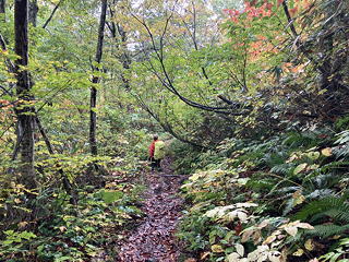 笹ヶ峰からしばらくは美しいブナ林の中の緩やかな登りで、そのところどころにはナメコをはじめとする各種キノコが生えていました。中には本格的に部隊を組んでキノコ採取に精を出している人たちもいましたが、このあたりは国立公園内かつおおむね国有林なので、許可を受けずにキノコを採取すれば違法となる可能性が大。もちろん我々が「とった」のは写真だけです。