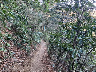 1号路を金比羅台経由で登って、前から何気に気になっているさる園の手前で右に下るのが2号路北区間の入口です。今回は1-6号路の一筆書きと称していますが、1号路に関してはここから山頂までの区間を割愛しなければならないのが残念ポイントです。ともあれ、アオキが目立つこの道は短く、すぐに4号路に接続します。