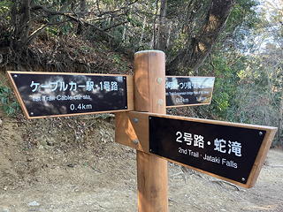 2号路と4号路の分岐点。これを左に行けば1号路上の浄心門です。4号路は高尾山の北斜面をトラバースしており、途中には吊り橋があったりするものの、概ね水平で歩きやすい道になっています。