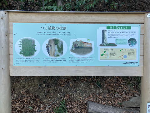 こちらは4号路の途中にあった解説。つる植物が絡みついた木は養分を失って枯れてしまうものの、キツツキや昆虫のすみかとなり、ついには土に環って新しい命を育てるのであるといった、なにやらありがたい話が書かれていました。また、つる植物の例としてテイカカズラが紹介されていましたが、テイカカズラと言えば、先日観た能「定家」の中で藤原定家の執心の象徴として式子内親王の墓にまとわりついていたアレです。この解説を見てからしばらく、左斜面を注意しながら歩いたのですが、テイカカズラらしきつる植物は見つけられませんでした。