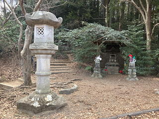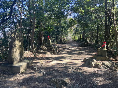 琵琶滝方面への道はかなり下ったところで尾根上の鞍部に達し、そこから左へ下れば6号路の下の方に出ますし、右へ下れば琵琶滝なのですが、その鞍部を通過してまっすぐの尾根上(通称「石仏広場」)にいくつもの石仏が並んでいることを、恥ずかしながらこれまで認識していませんでした。ここまでいいペースで歩けているのでそこに立ち寄ってみたところ、一番手前に椅子の上に安座した法体の人物を浅く彫った石碑があり、その向こうに揃いの赤い帽子とよだれ掛けを着用した一見地蔵菩薩風の仏さまが七体、尾根の左右に分かれて向かい合わせに並んでいましたが、たとえば一番奥の仏さまの台座には「第十五番 本尊薬師如来 阿波國國分寺」と彫られています。これは何だ?と思いながら戻ってきて先ほどの石碑を改めて見ると、こちらには「第十六番 本尊千手観音大士 阿波観音寺」とあってどうやら四国の札所と関係がありそう。そう言えばこの石碑に彫られている人物の手には五鈷杵らしいものがありますし、そもそも薬王院は真言宗智山派です。