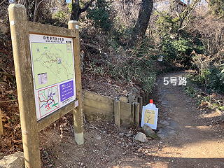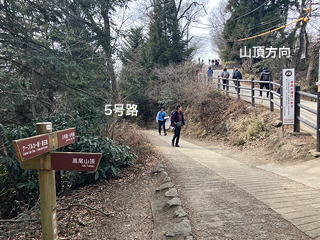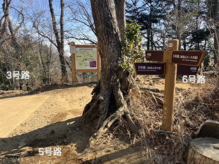 4号路をひたすら歩いていったん1号路に出て、すぐそこにある入り口から5号路に入ります。そして、高尾山の山頂をぐるっと回り込んで6号路が接するところで5号路をわずかに残して3号路に向かいます。この交差点には、高尾山山頂を踏んだ後で降りてくることになります。