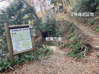 3号路の急な尾根下りとその後の長いトラバースをこなして2号路にぶつかったら、先ほど歩いた1号路横断区間を再び歩きます。この時間になると薬王院や山頂を目指す人の数が多くなってきました。こちらは蛇滝への道を横目に2号路の北区間を歩いて、1号路に戻ります。