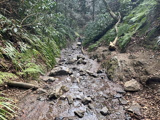 6号路は部分的に沢の中、そしてその後は沢沿いの道をひたすら下ります。なんとかトータルで3時間を切りたかったので、この区間はできる限り走りました。