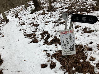 緩やかに高さを上げていく山道は途中で南方向と北方向に分岐しますが、山宮を目指す北向きのトラバース道は斜面に雪がかぶさってスリップしやすく、今回の山行の中で唯一緊張する区間となりました。