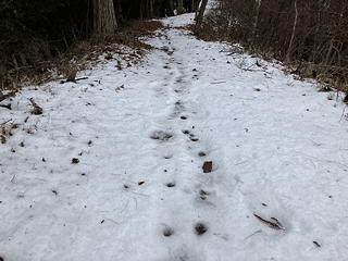 稜線上でもところにより雪はそこそこ残っており、その上に獣の足跡も残されています。私はチェーンスパイクを履き、アユミさんはつぼ足のままでの歩きですが、雪がまだ柔らかいままなのでチェーンスパイクでは足の裏に雪団子ができてしまってかえって歩きにくさを覚えました。