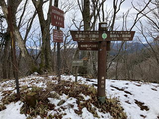 三国山、生藤山を越えて茅丸に登ると、丹沢方面の眺めが広がります。蛭ヶ岳も檜洞丸も低い雲の広がりの上に姿を見せていましたが、三角形の立派な山容を見せる大室山がとりわけ立派でした。