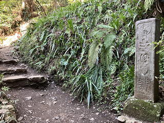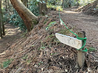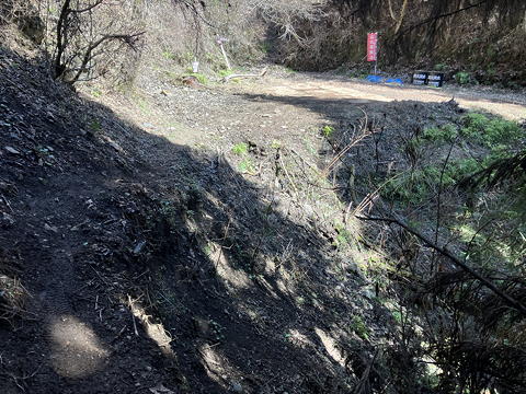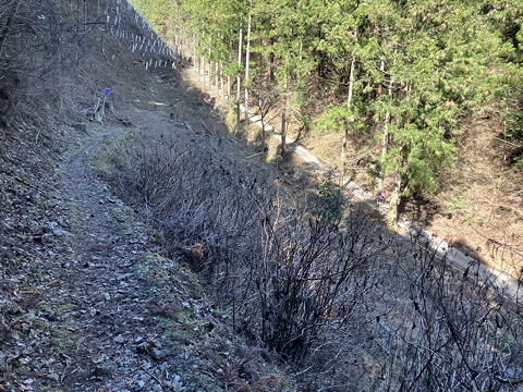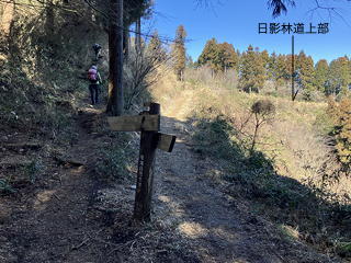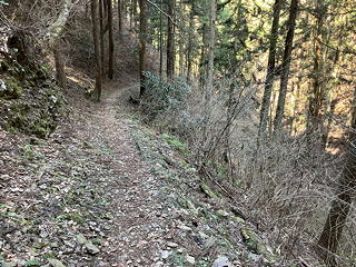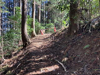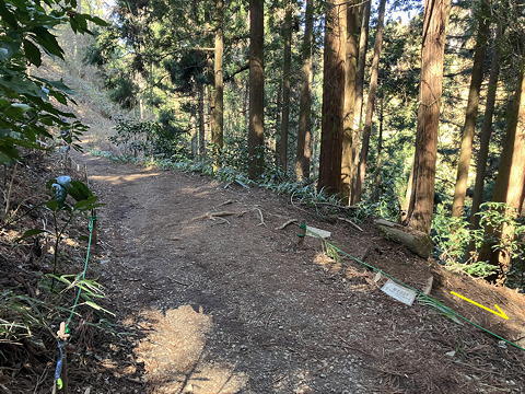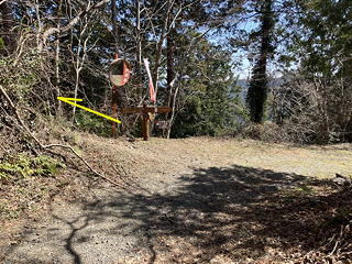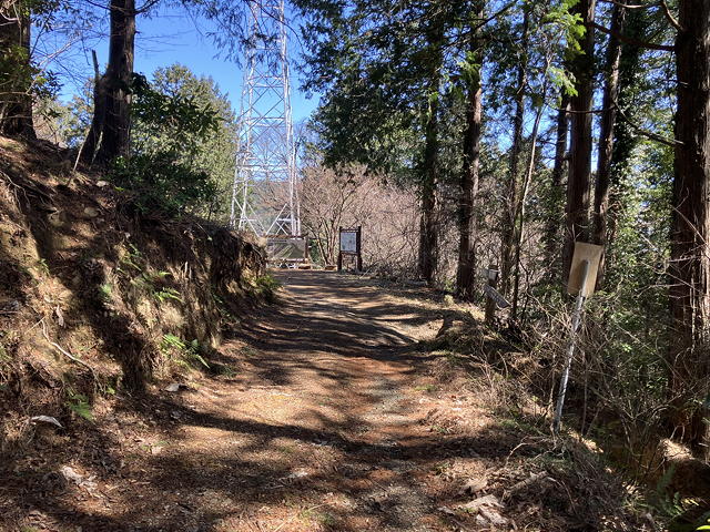 この道は日影林道の途中から高尾山方向へ戻る向きに斜面を上がっており、その入り口には特に歩行を遮る標識などはありません。また道自体も整備されており、部分的に路肩が崩れて道が狭くなっているところがありはしたものの、気持ちよく歩くことができたのですが……。