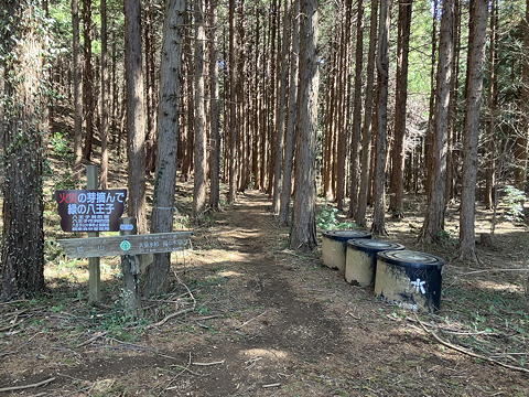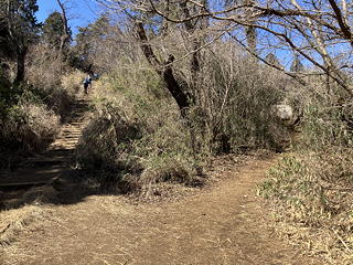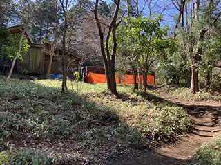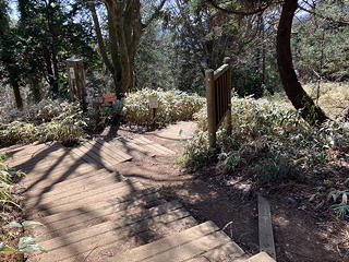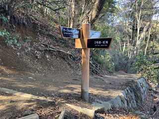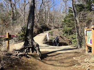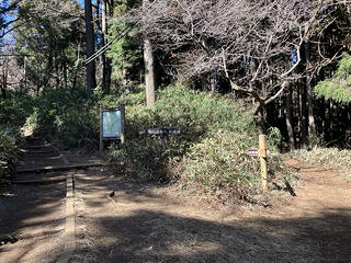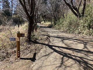 高尾山方向へ少し下り、大垂水峠へ下る右への道に入って急坂を下ること約10分で分岐が現れました。大垂水峠へはここを直進ですが、今日はここから左に入ります。