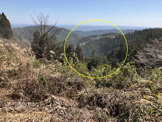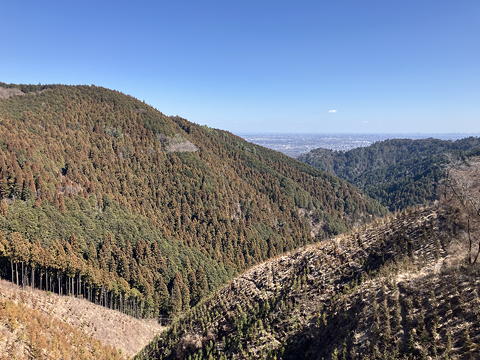 すると植林が大規模に伐採されて見通しがよくなった場所に出て、東京方面の眺めを得ることができました。それはいいのですが、その手前左にある顕著な尾根(先日歩いた日影乗鞍の尾根)の植林が花粉で真っ黄色です。恐ろしい……。