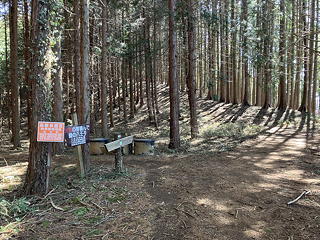 あれれ?登山道との合流点に着いてみると紅白のコーンとバーで通せんぼがしてあります。そこにぶら下げられた標識には「通行止」と書かれており、その理由は危険箇所(崩落)があるからというものでした。上述のとおり(少なくとも登りにとる分には)危険を感じるところはなかったのですが、それはこちらの勝手な感想に過ぎず、やはりこの道を歩いたことはよろしくなかったようです。スミマセン。