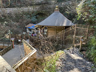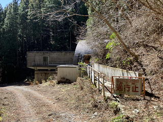 途中では一丁平から大垂水峠へ下る道と交差しながら、どこまでも水平に続いていた大平林道が例外的に高度を下げているところに国道20号から道が上がってきている三叉路があり、その下方向を見るとひっそりと建物が建っています。さてはあれが噂のアレかと思って立ち寄ることにしました。