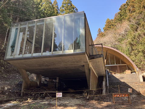 案の定、これが現在は閉鎖中の「森林ふれあい館」でした。コンクリートと木とを組み合わせた建物はずいぶん大きくモダンで、建設されたときの関係者の思い入れの深さを窺わせましたが、この立地ではおいそれとは来られそうにありません。これでは、維持費に見合う効果を上げることは難しかったのではないでしょうか?