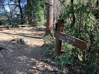 巻道はベンチのある小広場を経て縦走路本線に合流し、その先で再び分岐に出会います。左のしっかりした道を進めばダイレクトに小仏城山に登り着きますが、右の巻道を進むと日影林道の上部までトラバースすることになります。当然ここも右巻きです。