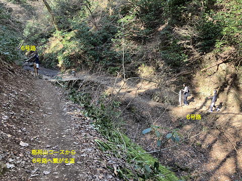 そのまま稲荷山コースを下るか、あるいは稲荷山コースをまたぎ越した先にある6号路を下れば簡便ですが、冒頭に記したようにこの山行では「山腹を極力巻」くことにこだわると決めているので、6号路に降り着いたら逆にこれを登り返しました。