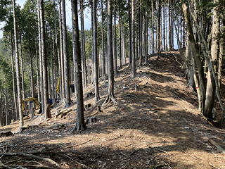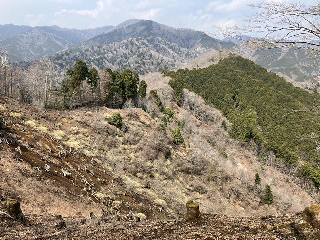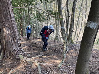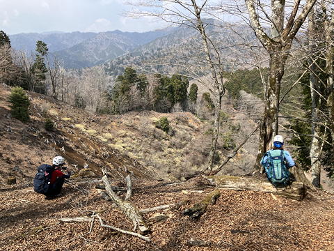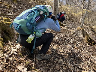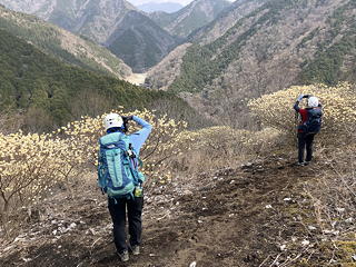 適当なところでミツマタ鑑賞を切り上げて、椿丸を目指します。実は、リナさんに所用があって浅瀬入口16時発のバスに乗らなければならないため、椿丸往復を割愛するかどうか大いに迷ったのですが、迷うくらいなら行きましょう!と覚悟を決め、一列縦隊で稜線上を突進しました。