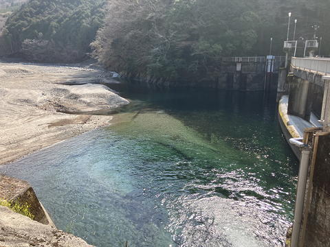 やがて法行沢を渡りましたが、まずはそのまま北上を続けます。大又ダムの貯水量はやはり相当に減っており、グリーンの湖面は美しくはあったものの、少々寂しい風情でした。
