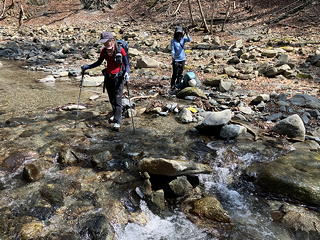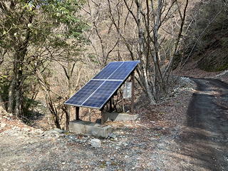 今度こそ法行沢沿いの林道に入り、おなじみのソーラーパネルから渡渉点に降りて、飛び石で法行沢を渡ったら、そこでヘルメットとチェーンスパイクを装着して急な尾根道に取り付きました。