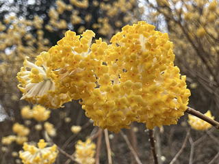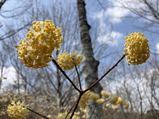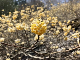 ちょうどこの頃から雲が広がり出し、空が白っぽくなってしまったためにミツマタの黄色の鮮やかさが捉えにくくなっていますが、それでもポンポンのような花をいくつも見つけては、つい際限なく写真を撮り続けました。