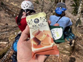 いつものように椿丸の手製山名標識が木にくくり付けられていますが、ここに来るたびにそのデザインが変わっているような気がします。もしかすると山に人工物を残すことを嫌う誰かが外して、そのたびに誰かが新しいものを持ってきているのでしょうか?しかし、以前問題提起した北鎌尾根の違法標識とは異なり、この場所でのこの程度の標識ならアリのようにも思います。そんなことを考えながら二人にもらったおやつと持参した湯で作ったミルクティーでほっこりしていると、あっと言う間に時間がたってしまいました。