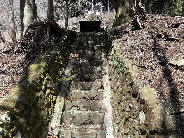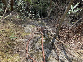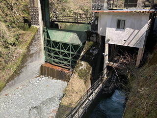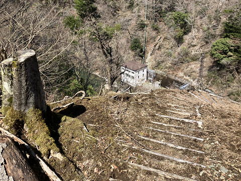 モノレール沿いに続く薄い踏み跡を辿ると送電線の下の切り開きが現れ、地形を読みながらこれを斜めに横断して左側の樹林帯に入って尾根筋を下ります。そして雨裂に架けられた橋を渡るとその先に玄倉川まで降りる道が現れ、玄倉第二発電所の姿が目に入りました。
