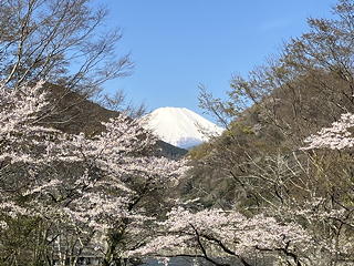 それでも玄倉に着いて富士山と桜の取り合わせを眺めれば気分も高揚してきますが、玄倉第一発電所の電光掲示板には「ダム放流中 河川増水注意」と表示されていました。一昨日の午後から昨日の午前まで雨が降っていたので想定されていたことではありますが、これは困りました。同角尾根は5年前の「丹沢グルメ巡り」の際に下っているので、今回は反対に尾根の末端から登って裸山丸まで達してから南に下り、玄倉川を渡って山神峠セクションに入るつもりだったのですが、それでは裸山丸から玄倉川まで降りたところで増水に遭遇すると途方に暮れることになってしまいます。そこでプランを変更し、予定の逆コースとなる山神峠セクション→同角尾根セクションの順に歩くことにしました。これなら、山神峠セクションを終えて玄倉川に降り着いたところで、増水の様子を見てGo/No-Goを決められるからです。